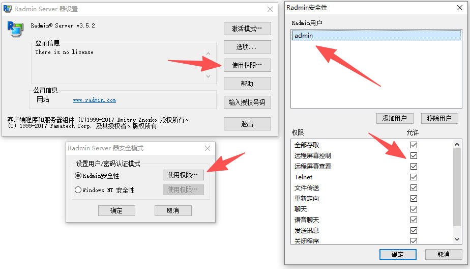 2、找一台已经安装好了Radmin server的机器,配置使用权限,Radmin安全性,添加Radmin用户、密码,并允许所有权限。如下图